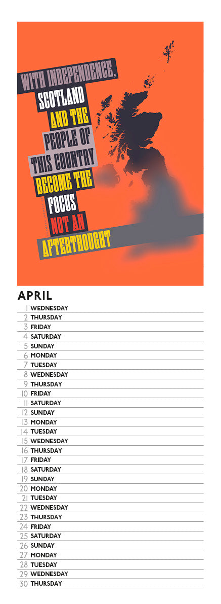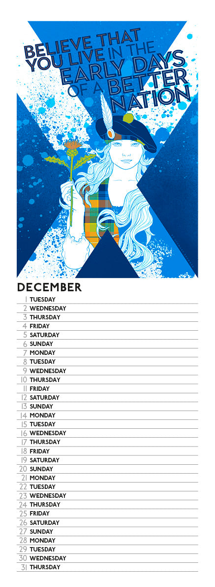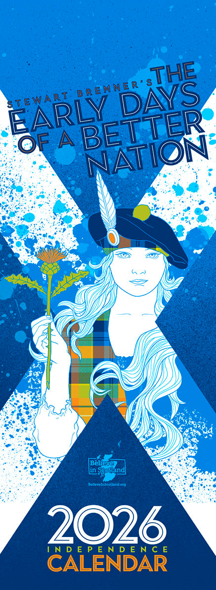 This 2026 independence calendar was drawn by Believe in Scotland’s graphic artist Stewart Bremner. It features twelve colourfully-illustrated images to support the campaign to win Scotland’s independence.