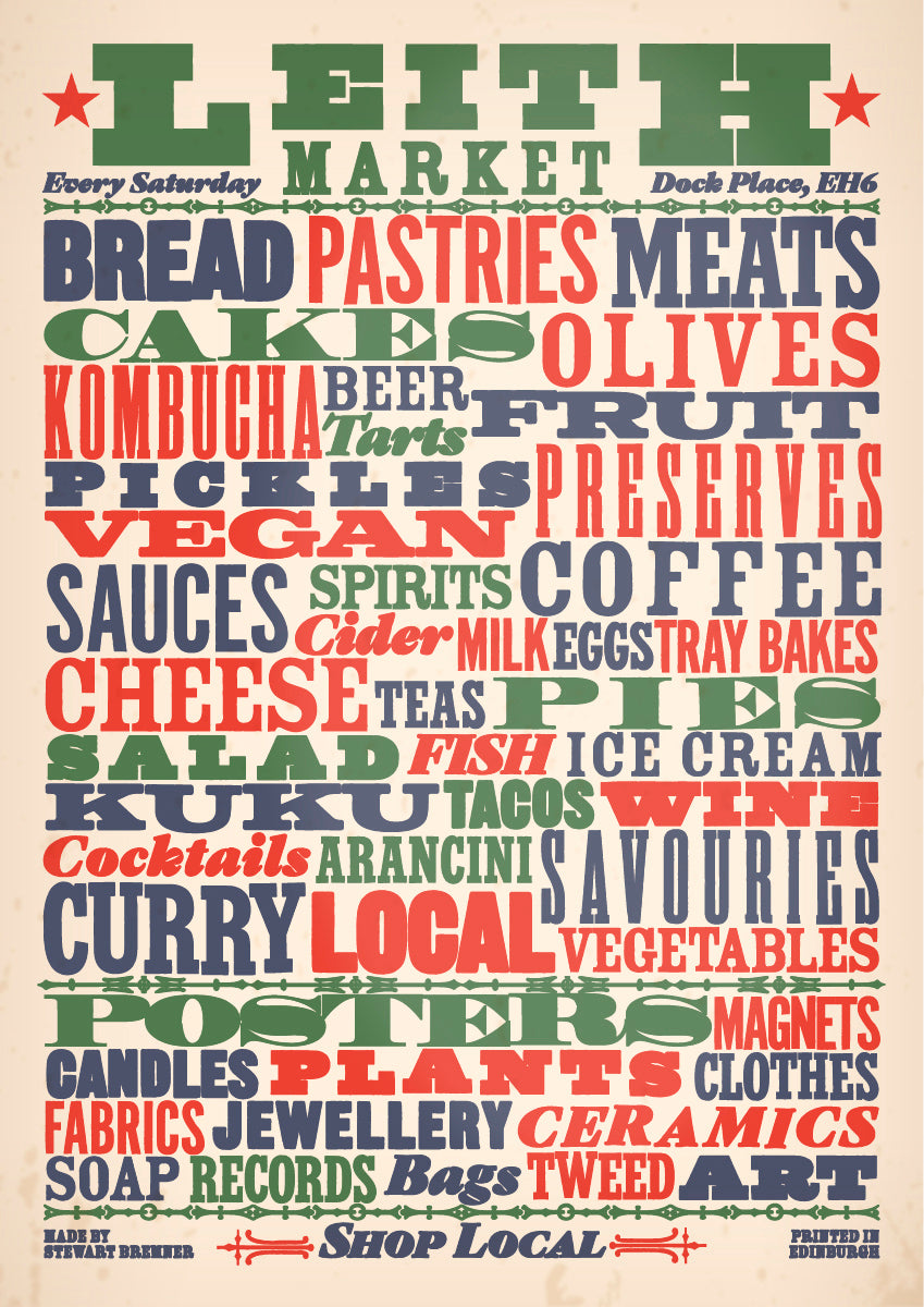Taking cues from 19th century bill posters, this design highlights just some of the things you'll find at Leith Market.