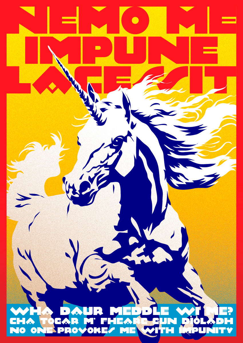 Taking inspiration from art and design of the twentieth century, this drawing combines Scotland's national animal, the unicorn, with three translations of the motto. Scots: "Wha daur meddle wi me"; Gaelic: "Cha togar m' fhearg gun dìoladh"; English: "No one harasses me with impunity." Basically, in modern parlance, it means "F*ck around and find out!"